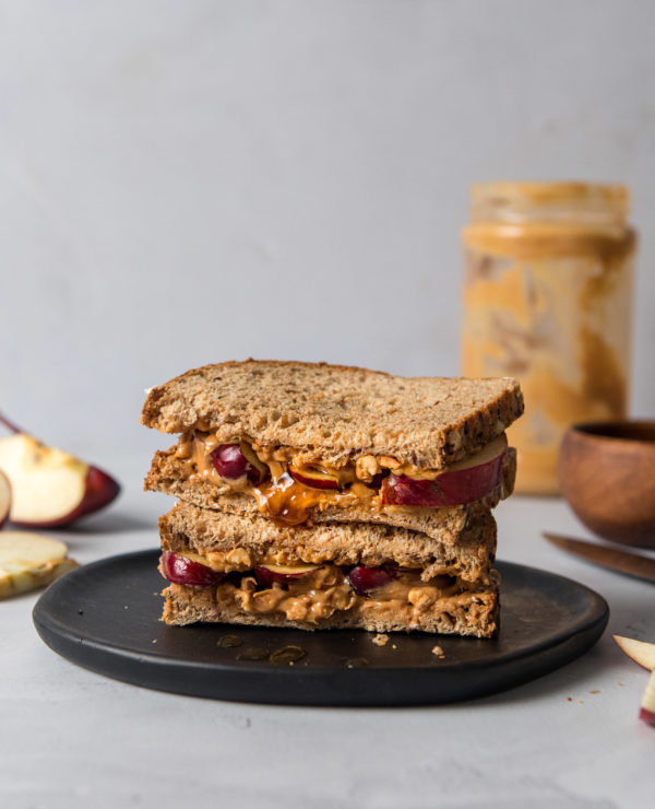 2. Spread peanut butter on both slices of bread then top one slice with cut apples. Drizzle honey over apple slices. Place the second slice on top of the apple slices. Cut in half and enjoy immediately or store for later.