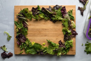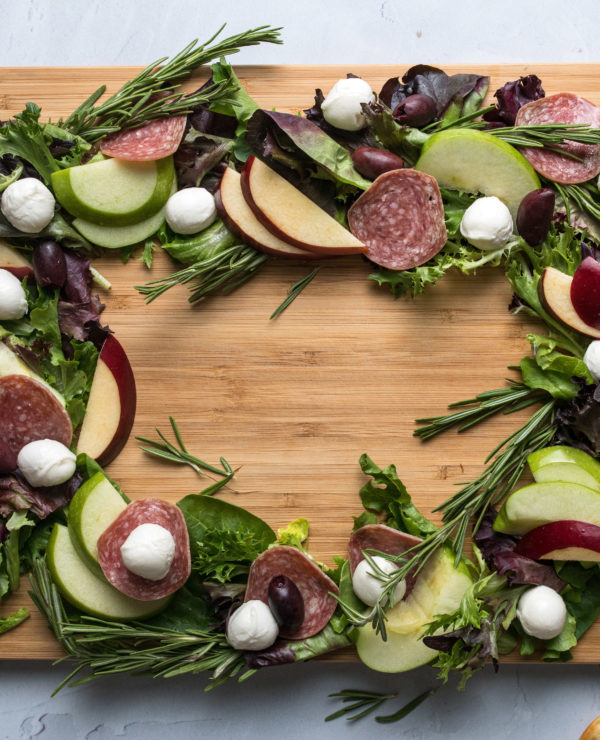 2. Place mixed greens in a wreath shape on a large plate or wooden board. Top with Granny Smith apples, then salami, Red Delicious apples, mozzarella, and olives. Then place rosemary sprigs throughout wreath to make it look nice. These sprigs can be used to pick up other ingredients (instead of a toothpick) or as garnish. Lay crackers out by wreath. Enjoy.